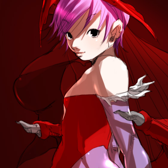 1girlbare shouldersbat wingsblack eyesdemon girlelbow glovesfemale focusflat chestgloveshead wingsleotardpantyhosepink hairred leotardshort hairsolowings