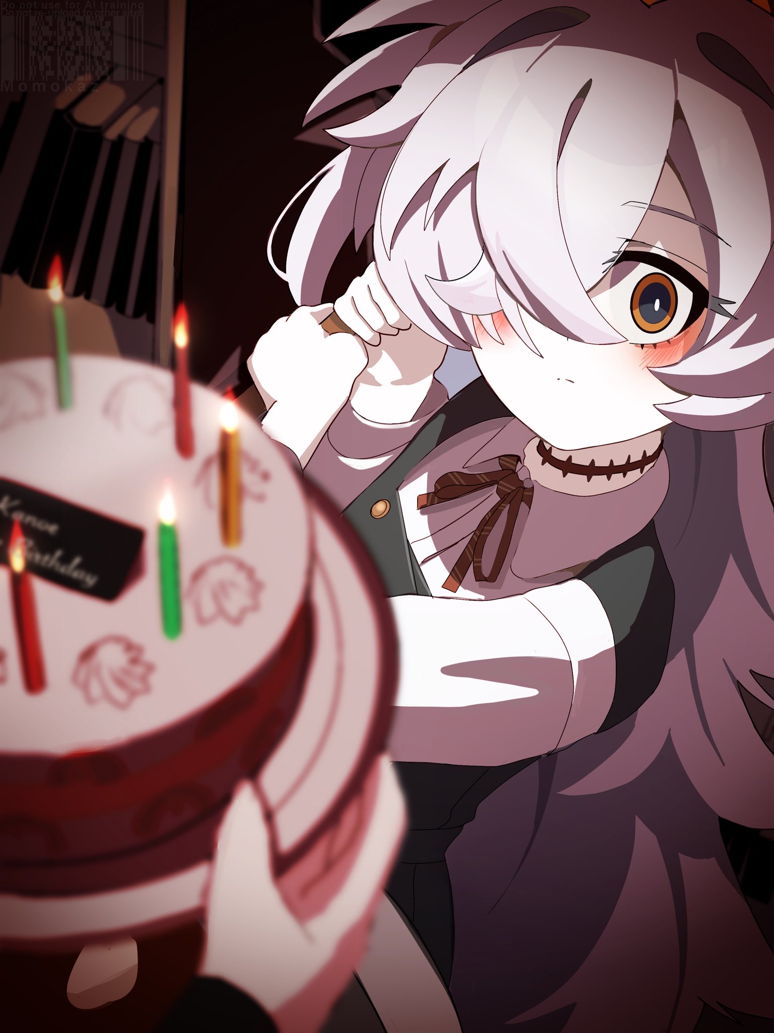 1girlbirthday cakeblushbrown eyescakecandlecollared shirtdressfoodgrey hairhair over one eyehappy birthdayindoorslong hairlong sleevespinafore dressred ribbonribbonscarscar on neckshirtsleevelesssleeveless dressvery long hairwhite shirt