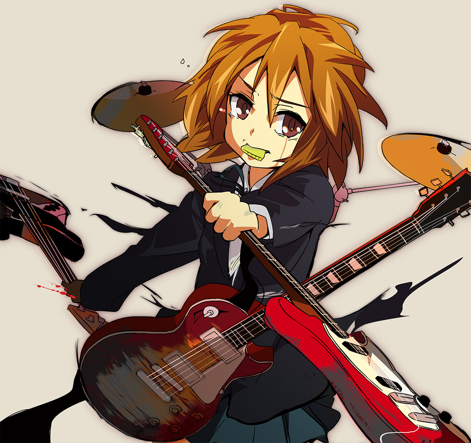 00s1girlbloodelectric guitarfemale focusfender (company)foodgibson les paulguitarinstrumentmouth holdmustang (guitar)plectrumschool uniformsolotakuantears