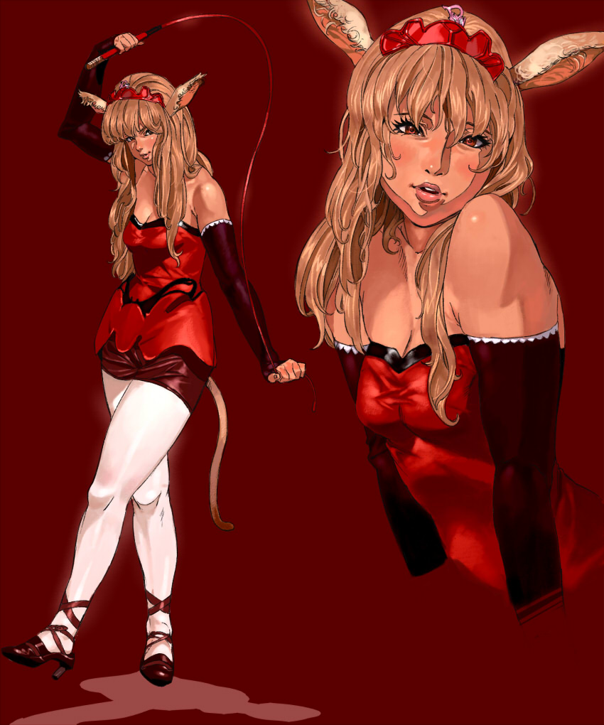 1girlanimal earsbare shouldersblonde hairbreastscleavagedetached sleevesdressfemale focushair ornamenthigh heelslegslipslipsticklong hairmakeuppantyhosered eyesshoessolotailwhip