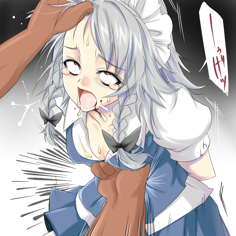 1girlbloodbraidbreastscleavagefemale focusgradient backgroundhair ribbonholdingholding own hairmaidmaid headdressmale handopen mouthpainpunchingribbonrolling eyesryonasalivaskirtsolostomach punchsweattearstwin braidsviolencewhite background