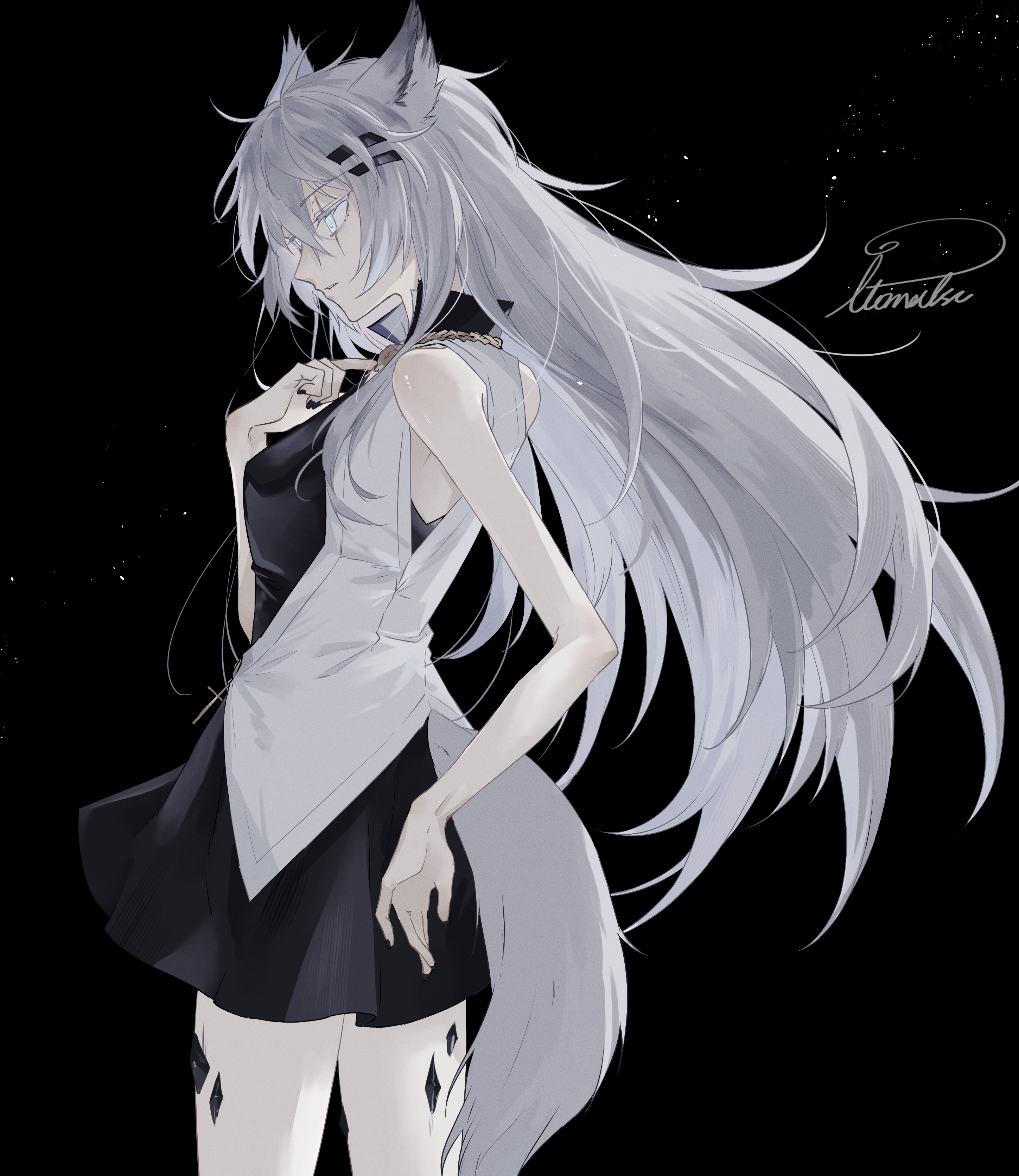 1girlanimal ear fluffanimal earsantenna hairarmpit creaseartist namebare armsbare legsbare shouldersblack backgroundblack dressblack nailsbreastscowboy shotcrossdressexpressionlesseyelashesfinger to neckfingernailsfloating hairfrom sidegrey eyesgrey hairgrey tailhair ornamenthaircliphand on own hiphand uphigh collarindex finger raisedjewelrylatin crosslight particleslong hairlooking afarlooking downmaterial growthmedium breastsmessy hairnail polishnecklaceoripathy lesion (arknights)outstretched handpale skinparted lipspopped collarprofilescarscar across eyescar on faceshort dresssignaturesimple backgroundsleevelesssolostandingtailteethvery long hairvestwhite vestwolf earswolf girlwolf tail