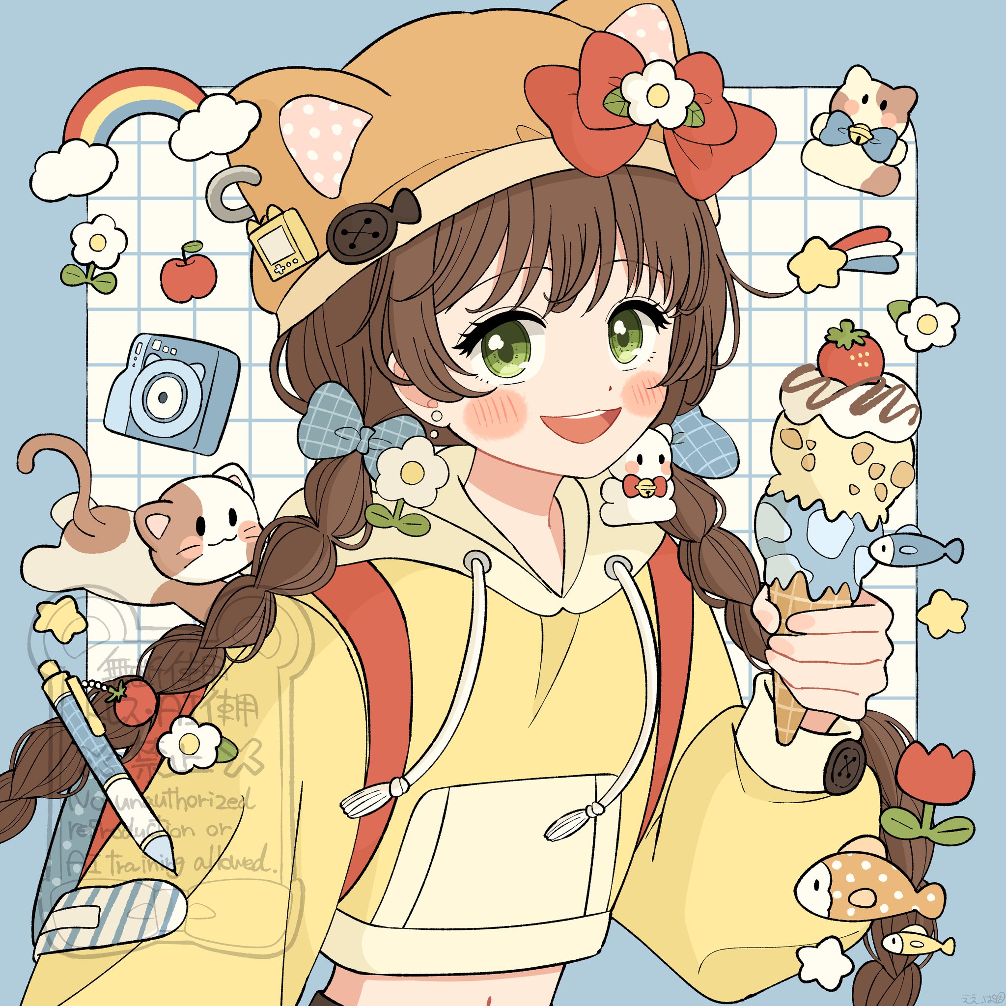 nanachides, cecilia immergreen, gigi murin, hololive, absurdres, commentary, english commentary, highres, 2girls, black boots, black gloves, black hat, black shirt, black shorts, blonde hair, boots, brown hair, closed mouth, constricted pupils, doll joints, gloves, green eyes, green hair, hat, joints, leaning forward, multicolored hair, multiple girls, shirt, short shorts, short sleeves, shorts, twintails, two-tone hair, v-shaped eyebrows, virtual youtuber, white hair