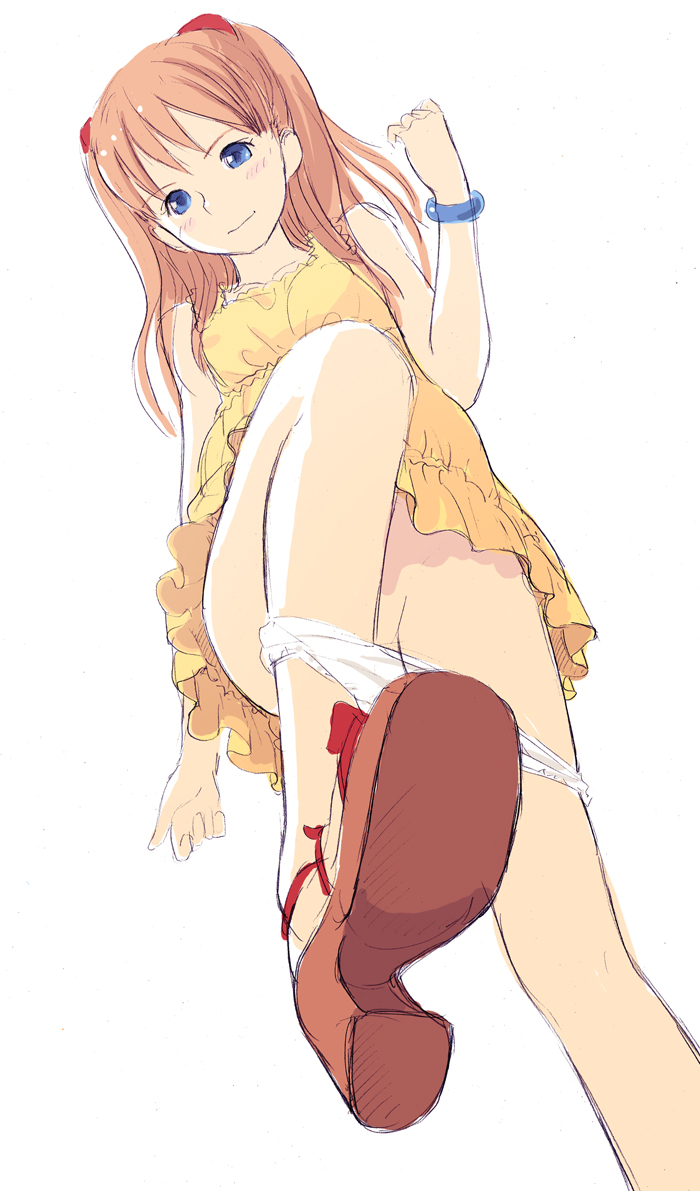 1girlblue eyesdressfemale focushigh heel sandalshigh heelspantiespanty pullplatform heelsred hairsandalsshoe solesshoessimple backgroundsketchsolotwintailstwo side upunderwearupskirtwhite backgroundwhite pantieswristbandyellow dress