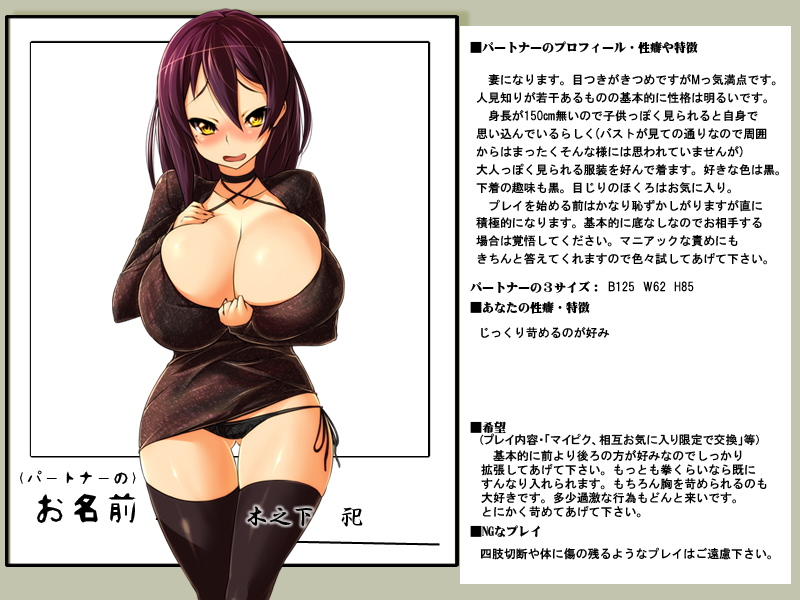 1girlblushbreastscharacter profilechokercleavagefemale focushuge breastslong hairlowleglowleg pantiesmeasurementsmolemole under eyeopen mouthpantiespurple hairside-tie pantiessolotext focusthighhighsunderwearyellow eyes
