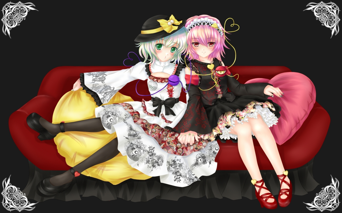 2girlscouchdressfemale focusgothic lolitagreen eyeshairbandhearthigh heelsholding handslegslolita fashionmultiple girlspantyhosepurple eyespurple hairshoesshort hairsiblingssistersskirt