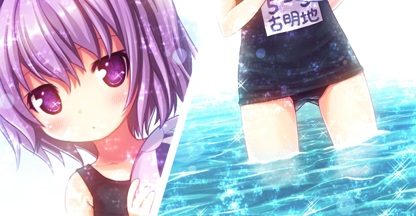 1girlballbeachballfemale focusone-piece swimsuitpurple eyespurple hairschool swimsuitsoloswimsuitwadingwater