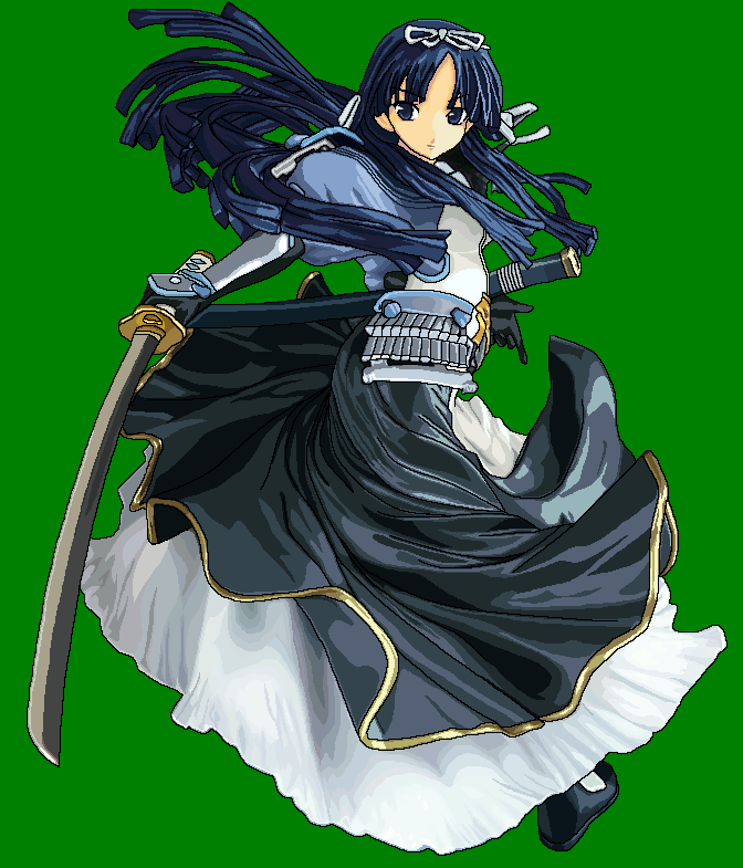 1girlarmorarmored dressblue eyesblue hairdressgreen backgroundkatanalong hairsimple backgroundswordweapon