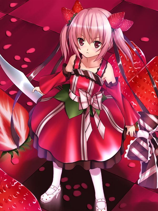 detached sleevesfoodfood as clothesfood-themed clothesfruithair ornamenthair ribbonlooking uppantyhosepink eyespink hairribbonsolostrawberrytwintails