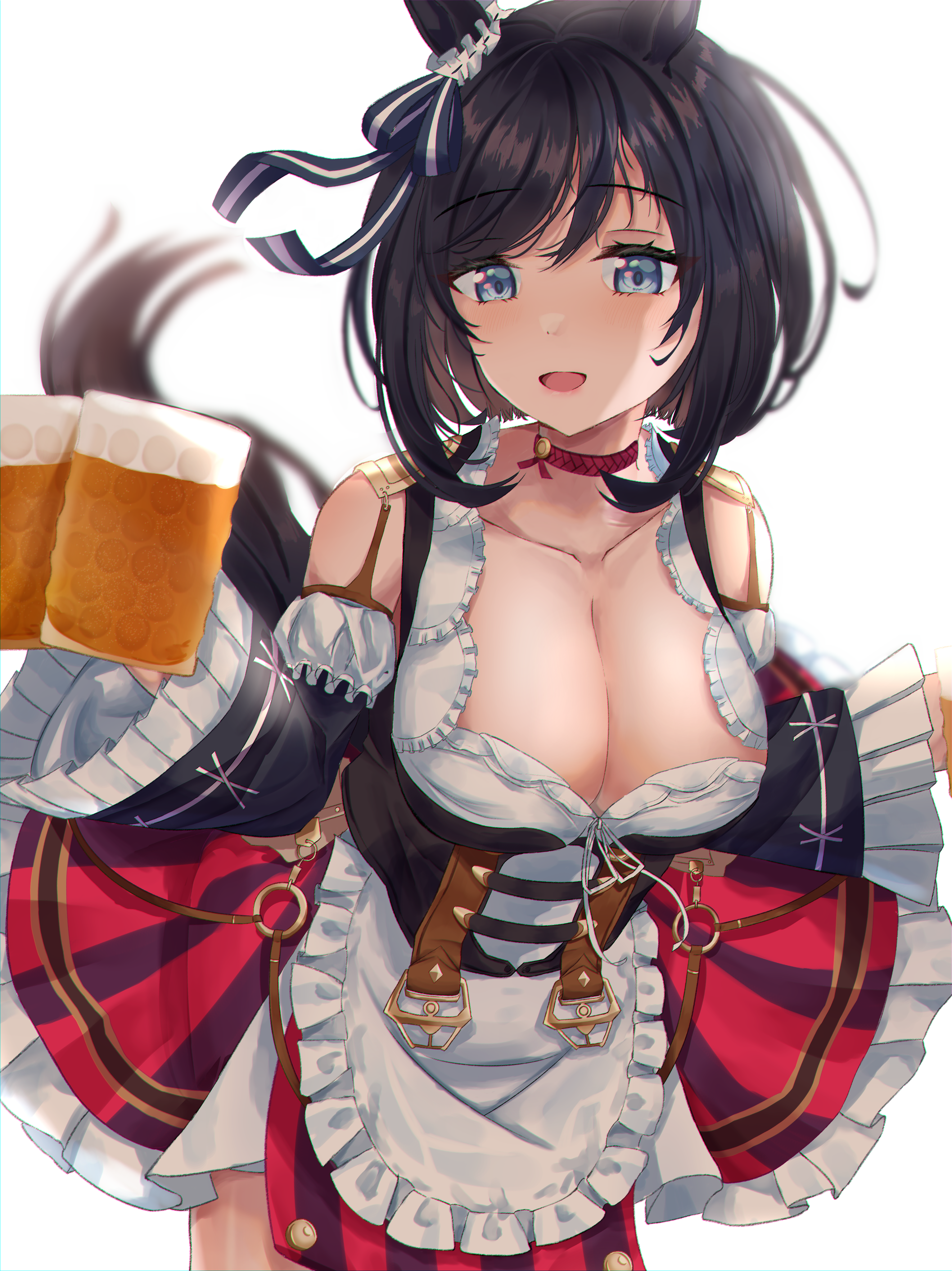 dasshu (dashi now), rita (shingeki no bahamut: genesis), shingeki no bahamut: virgin soul, highres, 1boy, 1girl, ascot, black coat, black dress, black gloves, black hair, blunt bangs, boots, character name, choker, coat, collarbone, dress, full body, gloves, hair over one eye, holding hands, long sleeves, mugaro (shingeki no bahamut: virgin soul), pom pom (clothes), purple hair, white ascot