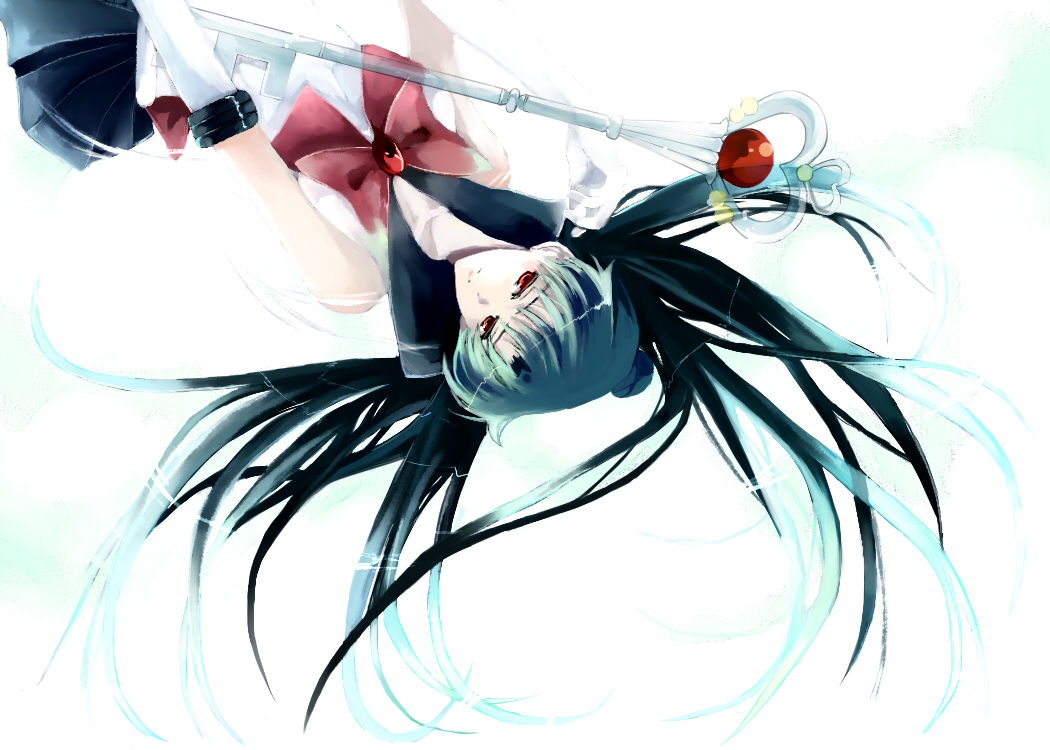 1990s (style)1girlbowelbow glovesfemale focusgarnet rodglovesgreen hairhair bunlong hairmagical girlno chokerred bowred eyesretro artstylerodsingle hair bunsolostaffupside-downvery long hairwhite gloves