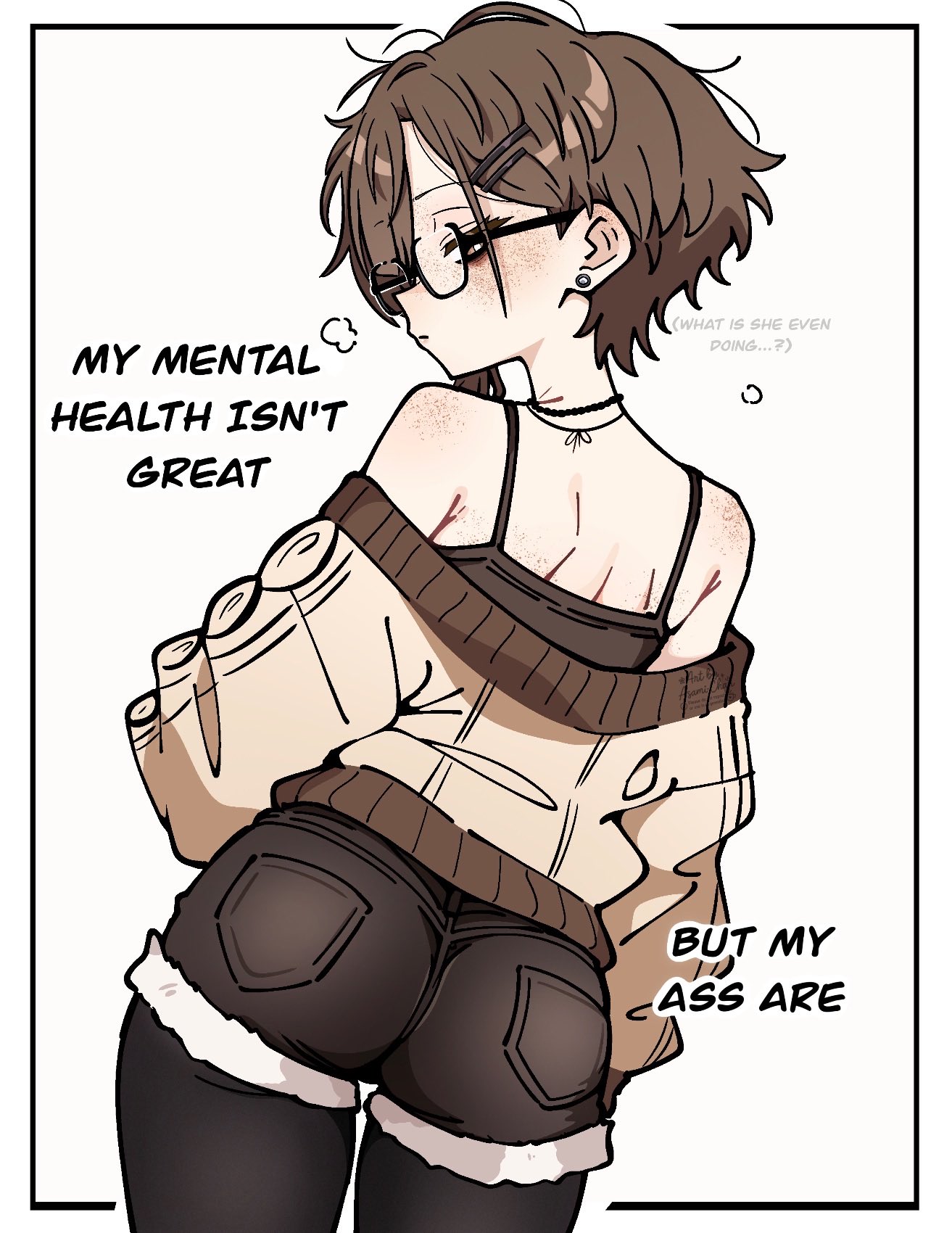 1girlassbare shouldersblack pantyhoseblack-framed eyewearbody frecklesbrown eyesbrown hairearringsenglish textfrecklesfrom behindfur trimfur-trimmed shortshair ornamenthairclipjewelrylong sleeveslooking backoff shoulderpantyhoseshirtshort hairshort shortsshortssleevelesssolot-shirtthighswhite background