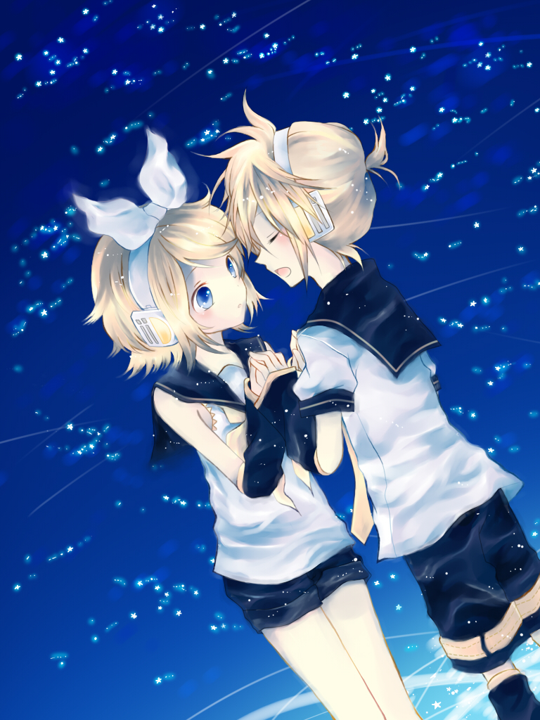 1boy1girlblonde hairblue eyesbrother and sisterclosed eyeshair ornamenthair ribbonhairclipheadphonesheteroholding handsmidriffopen mouthribbonsailor collarshort hairshortssiblingstwins