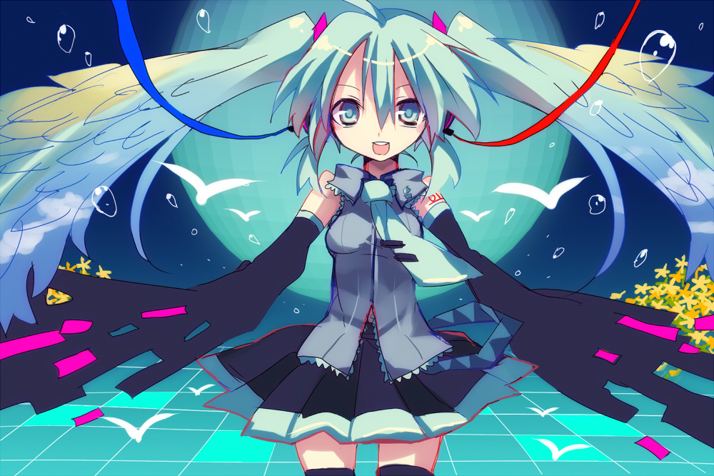 aqua eyesaqua hairdetached sleevesheadphoneslong hairnecktieskirtsmilesolosquare-end necktiethighhighstwintailszettai ryouiki