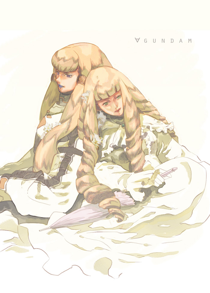 auge (akd), ryuko (oggyoggy), m.u.g.e.n, original, commentary, highres, 1girl, blue eyes, breasts, fingerless gloves, gloves, long hair, neckerchief, panties, pleated skirt, ponytail, ribbon, school uniform, serafuku, simple background, skirt, solo, torn clothes, underwear, white background, yellow neckerchief, yellow ribbon