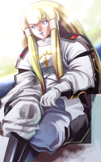 1girlblonde hairblue eyesblunt bangscrosselbow glovesfemale focusglovesknee padssidelockssittingsolowhite gloves