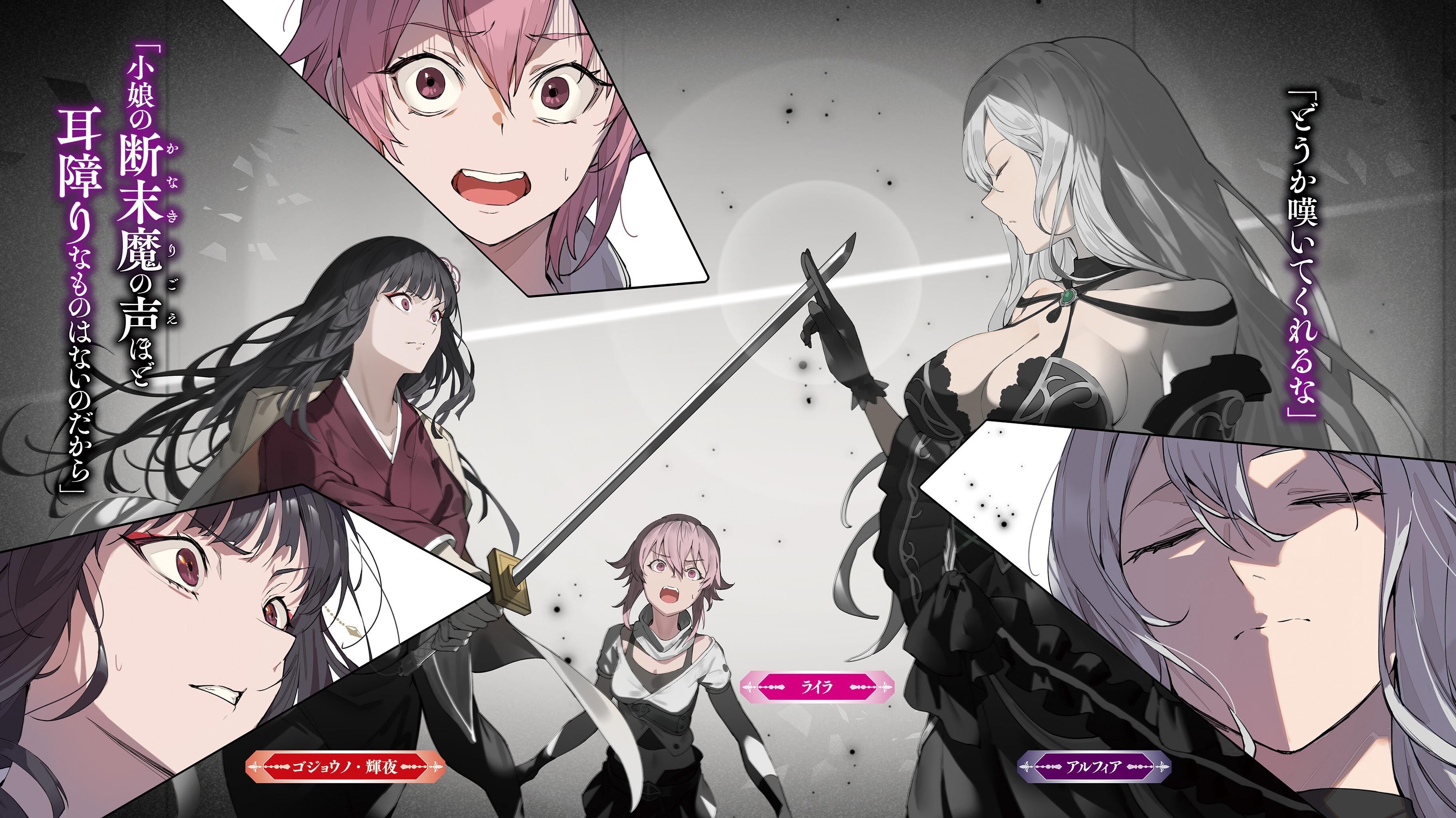3girlsblack dressblack glovesblack hairblack sleevesbreastscapecleavageclosed eyesclosed mouthdetached sleevesdresseyelinerglovesgrey backgroundgrey hairhand upholdingholding swordholding weaponjapanese clotheskatanakimonolong hairlooking at anothermakeupmedium breastsmultiple girlsopen mouthpink hairred eyelinerred kimonoshaded faceshirtshort hairsurprisedsweatdropswordweaponwhite capewhite shirt