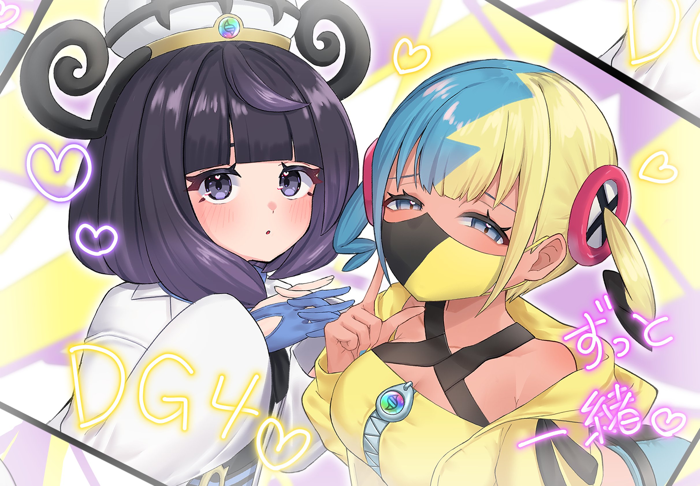 2girlsaqua hairbandeaubare shouldersblack dressblack hairblack maskblack pantsblonde hairblue eyesblue glovesblue pantsblunt bangsblushbob cutbreastscoatcollarbonecriss-cross strapsdark skindark-skinned femaledressglovesgradient hairhatheartjacketlarge breastslong sleeveslooking at viewermaskmega stonemouth maskmulticolored hairmulticolored nailsmultiple girlsopen clothesopen coatpantsparted lipspartially fingerless glovespurple eyespurple hairshort hairshort twintailssplit-color hairsports bratwintailstwo-tone hairtwo-tone masktwo-tone nailstwo-tone pantswhite coatyellow bandeauyellow jacketyellow maskyellow sports bra