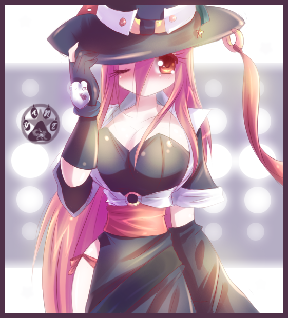 blushbreastscleavagedetached sleevesdressgloveshatlarge breastslong hairpantiesred hairside-tie pantiesunderwearvery long hairwinkwitch hat