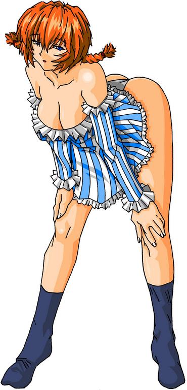 1girlassbare legsbare shouldersblue eyesbraidbreastscleavagecosplaydressfemale focushands on own kneeslarge breastsleaning forwardorange hairpantiesproduct girlsimple backgroundsockssolostriped clothesstriped dresstwin braidsunderwearwendy (wendy's) (cosplay)white background