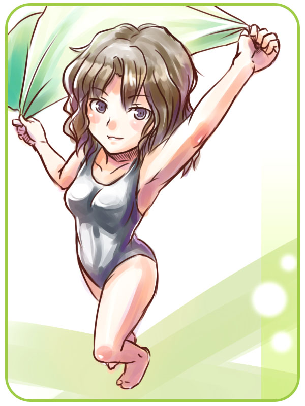 1girlarmpitsbarefootbrown hairfeetfemale focusone-piece swimsuitperspectiveshort hairsoloswimsuittoestowel