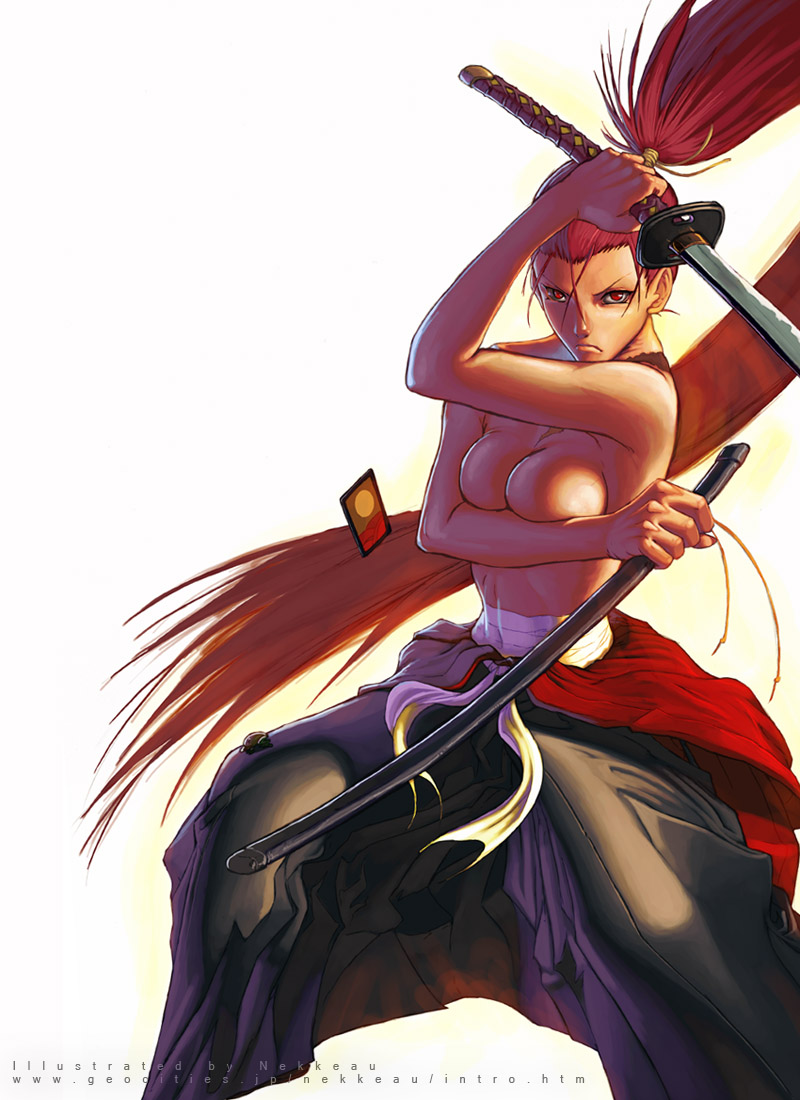 1girlbreastsgenderswaphanafudajapanese clotheslong hairponytailred eyesred hairscarsheathswordtopless femalevery long hairweapon