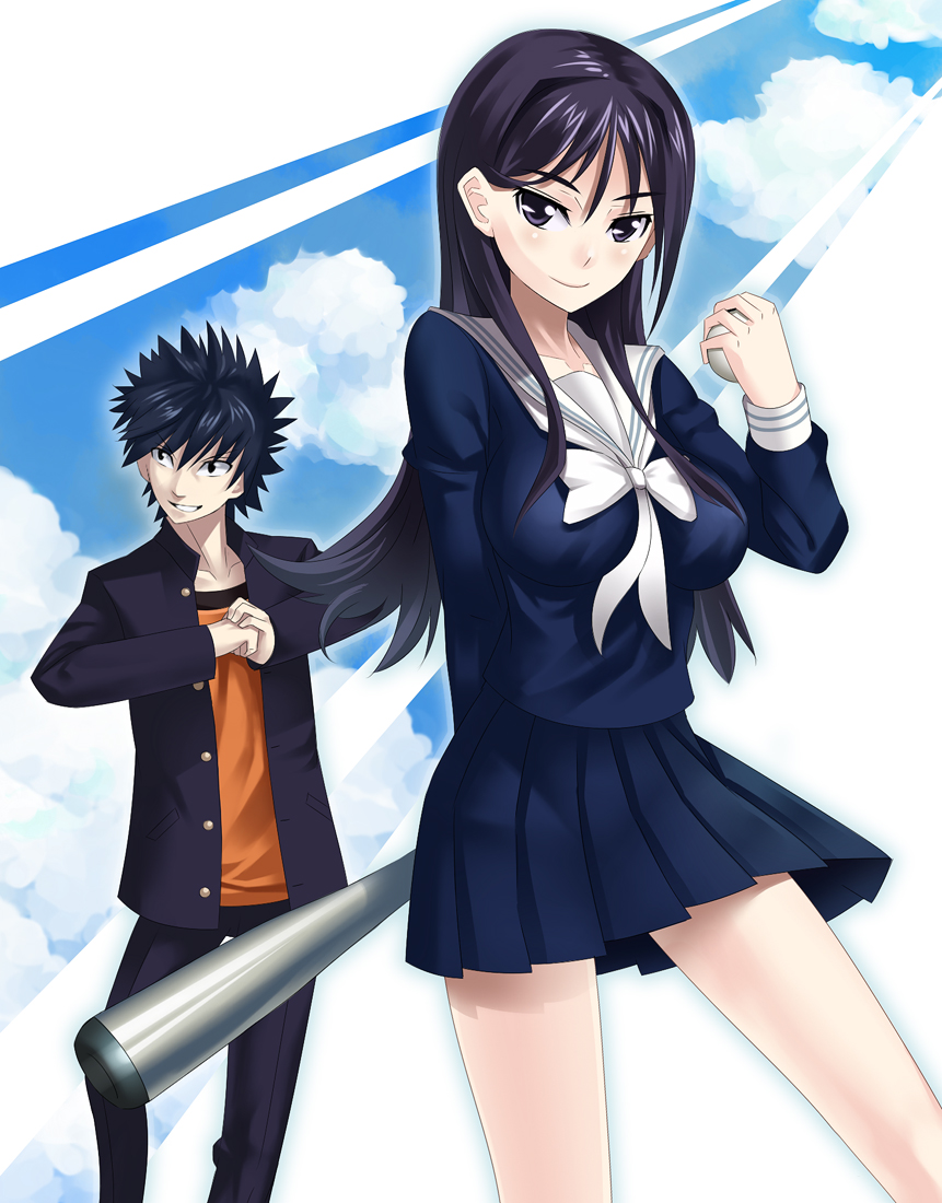 00sbaseball batblack haircloudmetal baseball batpurple eyespurple hairschool uniformserafukuskirtskysmile