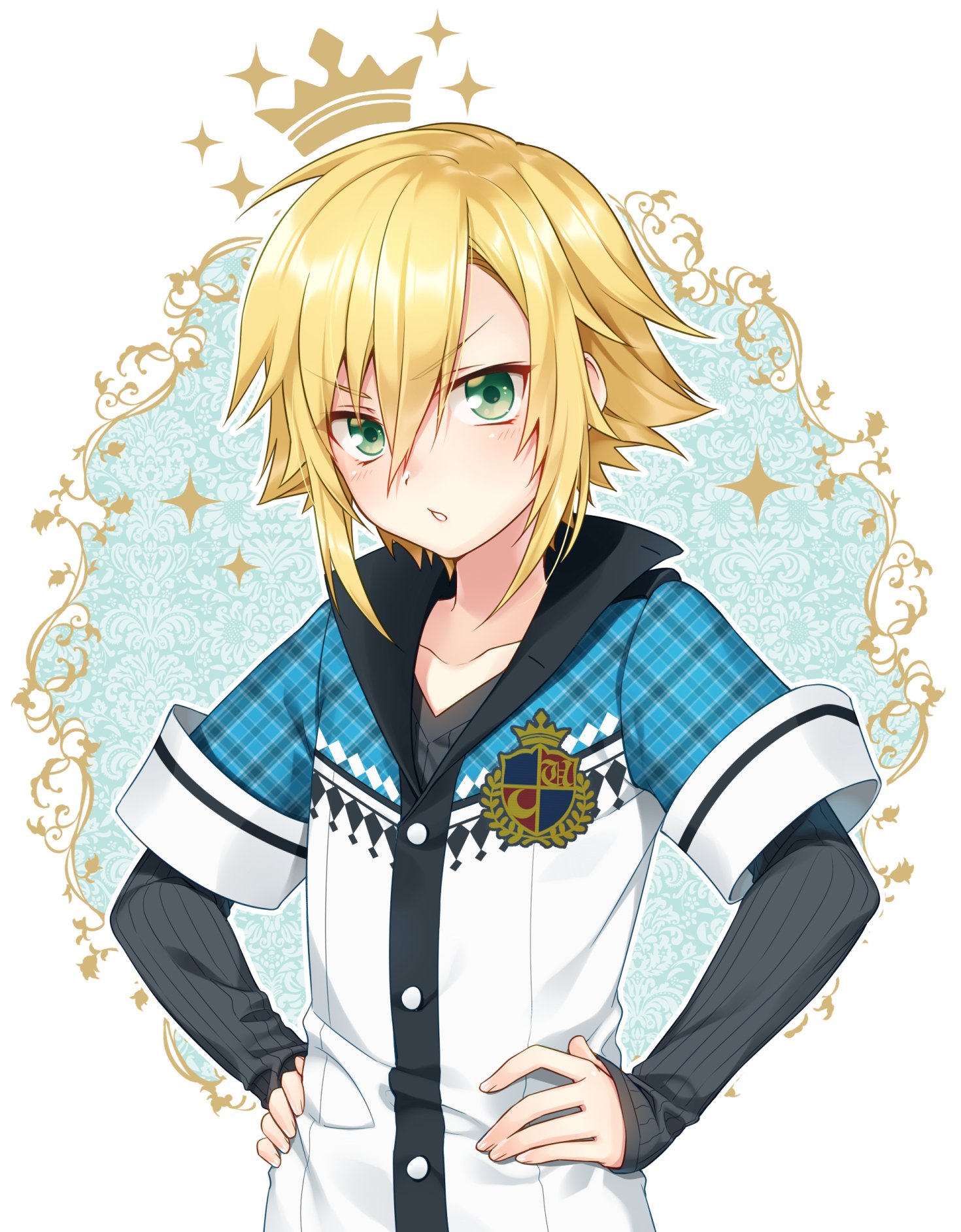 1boyblonde hairblue jacketblushbuttonscollarbonecollared jacketdrawn crownflipped hairgreen eyesgrey shirthair between eyeshands on own hipsjacketlayered sleeveslong sleeveslooking at viewermale focusparted lipsplaid clothesplaid jacketribbed shirtshirtshort hairshort over long sleevesshort sleevessidelockssleeves past wristssolosparkle backgroundstandingupper bodyv-neckv-shaped eyebrowsvirtual youtuberwhite backgroundwhite jacket