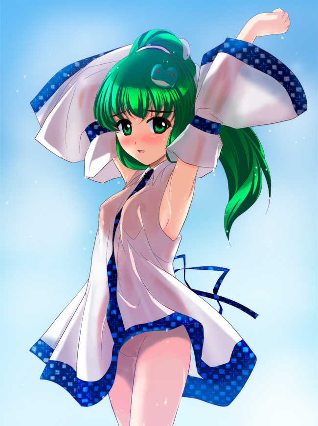 1girlalternate hairstylearmpitsarms upblushbottomlessbreastscovered erect nipplesdetached sleevesfemale focusfroggreen eyesgreen hairhair ornamentmatching hair/eyesmedium breastsno brano pantiesponytailsee-through clothesshirtsideboobsnakesolowetwet clotheswet shirt