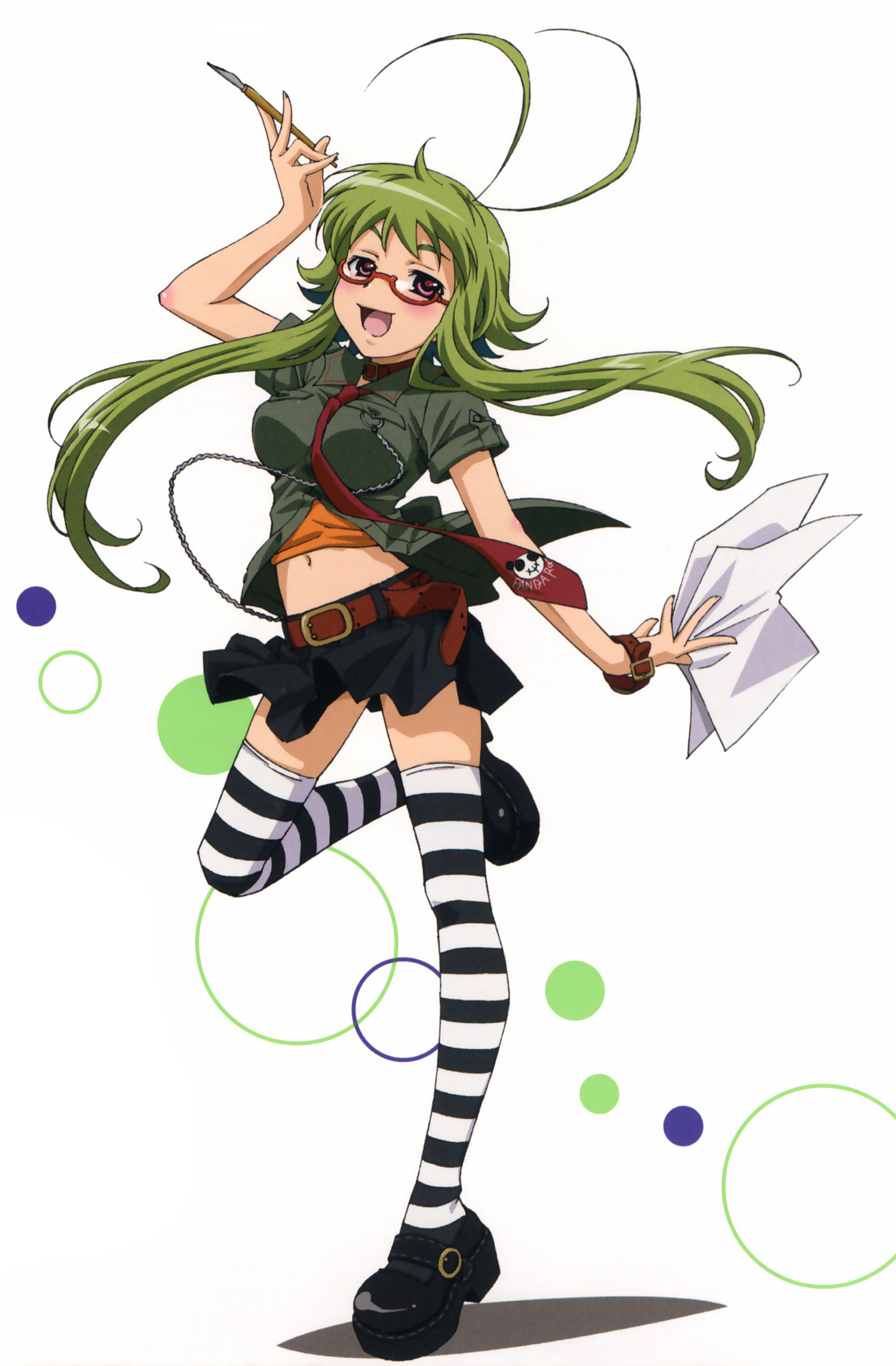 00s1girlantenna hairbeltblushfemale focusglassesgreen hairhappyleg liftlegslong hairmidriffnecktiepaperpenpurple eyesred eyesshort hair with long locksskirtsolostriped clothesstriped thighhighsthighhighstwintailszettai ryouiki