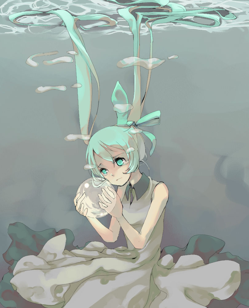 1girlaqua eyesaqua hairbubbledressfemale focusfloating hairhair ribbonlong hairribbonsolotearstwintailsunderwater