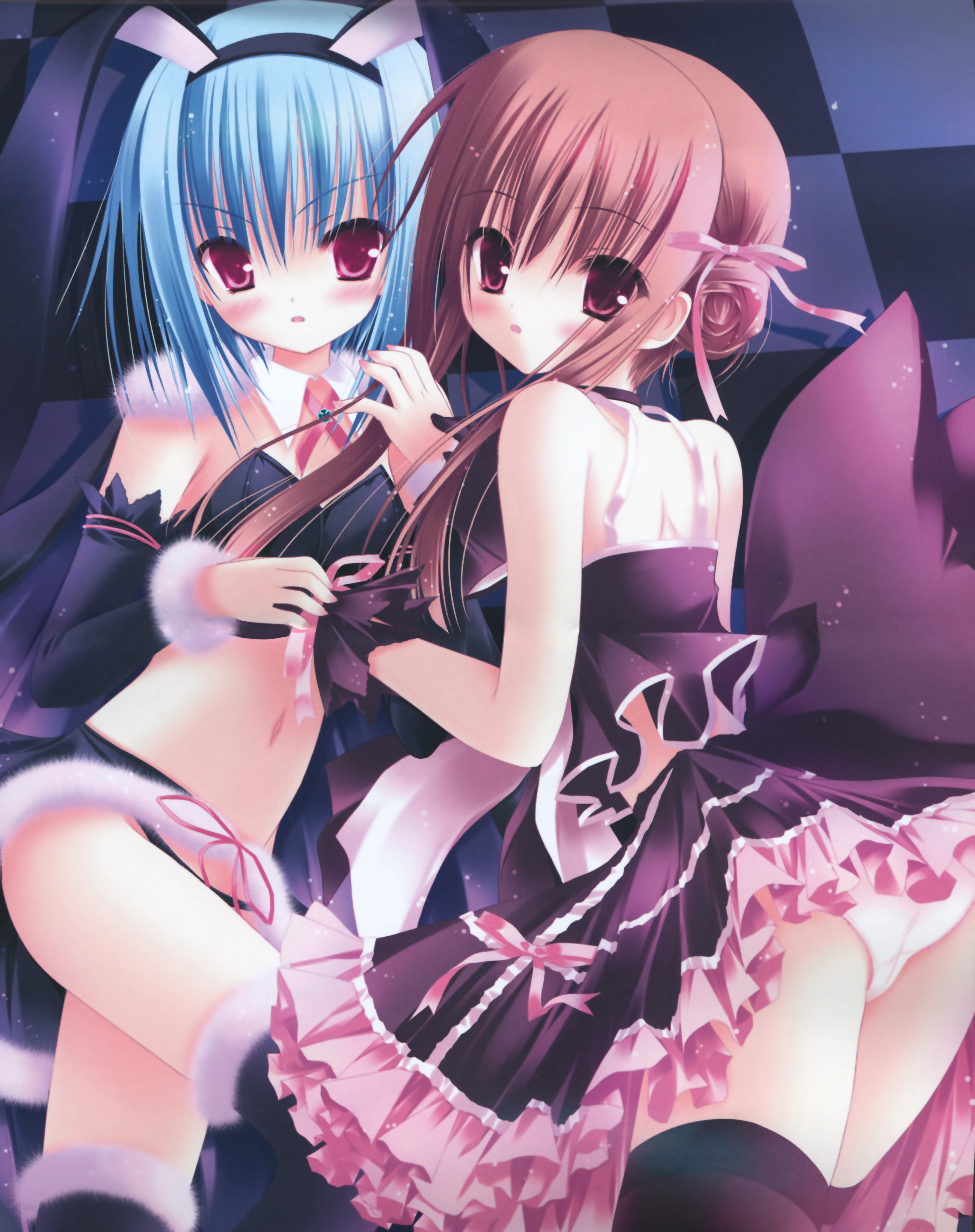 2girlsanimal earsblushdresslingeriemidriffmultiple girlsnavelpantiespetticoatrabbit earsred eyesthighhighsunderwear