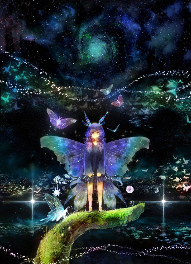 1girlbugbutterflybutterfly wingsfairyfemale focusglowinginsectinsect wingslegs apartnightnight skyoutdoorsplantpurple eyespurple hairskysolostandingstar (sky)star (symbol)starry skywings