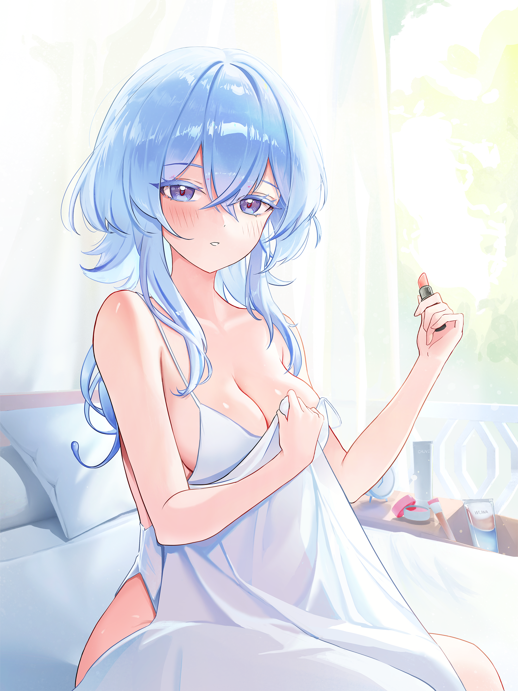 1girlalternate costumebare shouldersblue hairblushbreastscleavagecollarbonecolored eyelashescosmeticshair between eyesholdingholding lipstick tubeindoorslarge breastslipstick tubelooking at vieweron bedparted lipspurple eyessolostrap slipunder covers