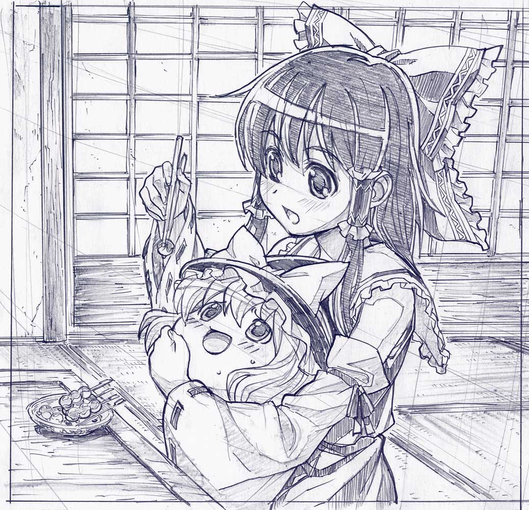 1girlblue themebowcarryingchopsticksdangodetached sleevesfeedingfemale focusfoodhair bowhair tubeshathat bowjapanese clothesmikomonochromeshoujisketchsliding doorssolotatamiwagashiwitchwitch hatyukkuri shiteitte ne