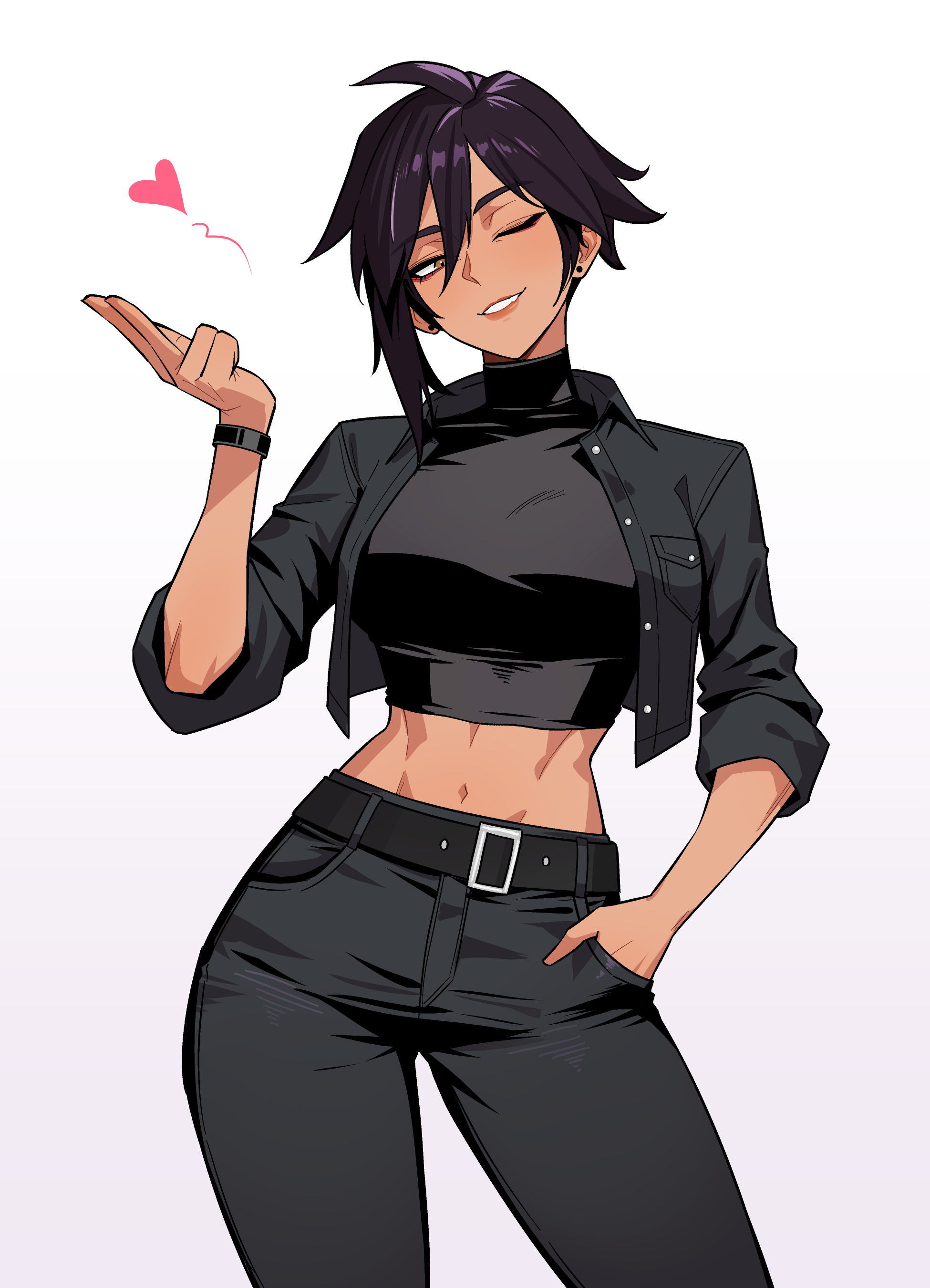 1girlbeltblack hairblack jacketblack pantsblack shirtbreastsbrown eyesclosed mouthcrop topdark skindark-skinned femaleearringshair between eyeshand in pocketheartjacketjewelrylong sleevesmedium breastsmidriffnavelno piercingsone eye closedpantsshirtsimple backgroundsolowatchwhite backgroundwristwatch