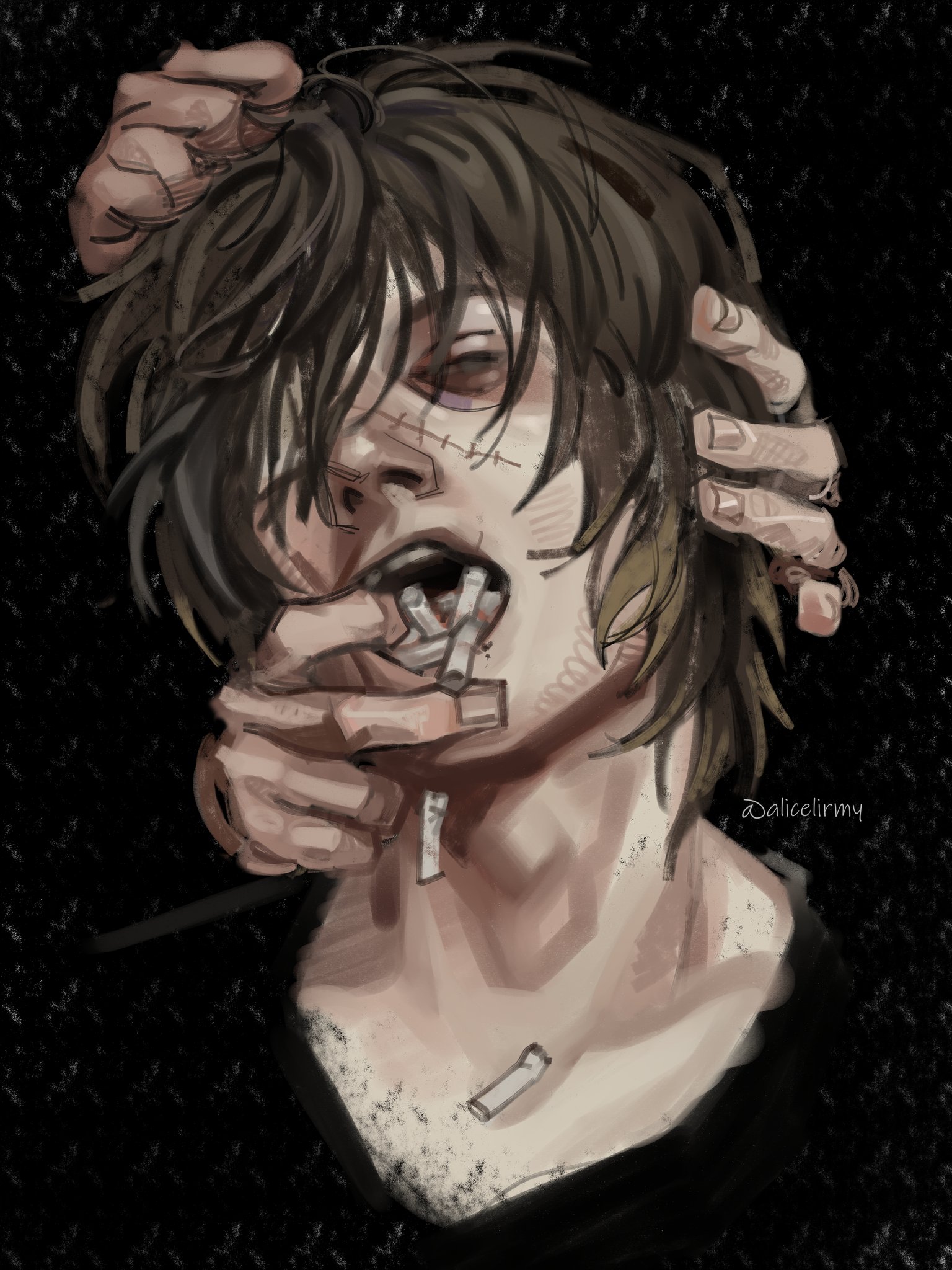 1boy2othersalicelirmybags under eyesbeard stubbleblack eyesblack shirtbrown haircigarettedisembodied handexhaustedfacial hairgrabbing another's hairhead tiltholding another's hairlooking at viewermouth pullmultiple othersone eye coveredopen mouthout of frameshirtshort hairstitchesstubbletoo many cigarettes