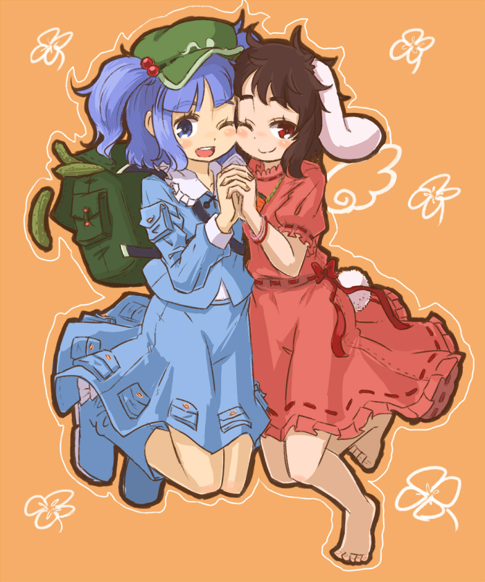 2girlsanimal earsbackpackbagbarefootblack hairblue eyesblue haircucumberfemale focushair bobbleshair ornamenthatholding handslooking at viewermultiple girlsone eye closedrabbit earsrandoserured eyesshort hairsimple backgroundsmiletwintailstwo side up