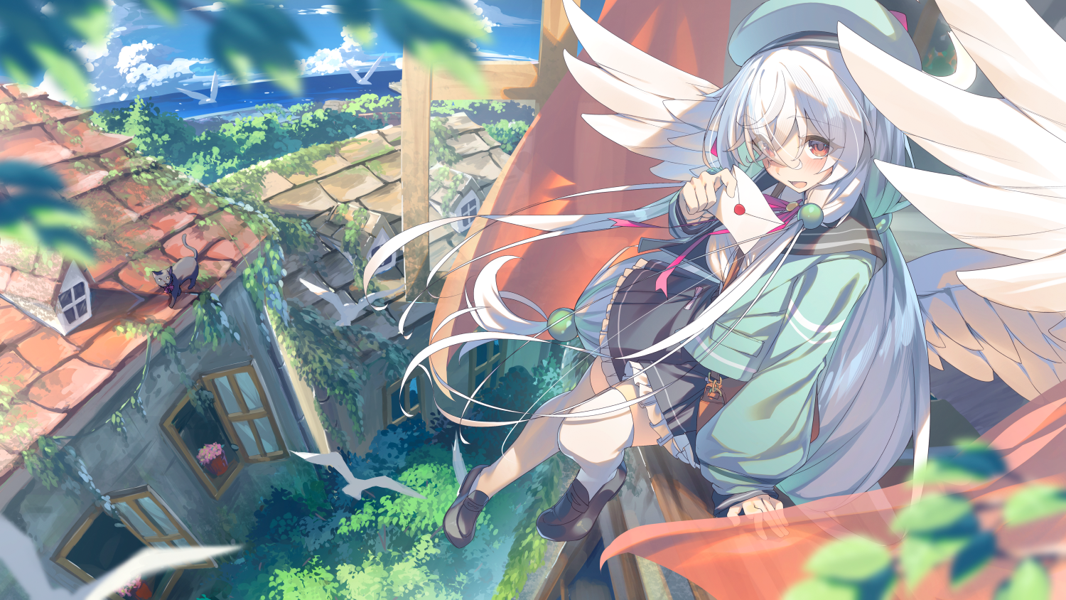 1girlberetblack sailor collarblack shoesblack skirtenvelopefeathered wingsfrilled skirtfrillsgreen hatgreen shirthatholdingholding envelopeletterlong hairlong sleevesopen mouthred eyessailor collarsailor shirtshirtshoessittingskirtsolothighhighstwintailswhite hairwhite thighhighswhite wingswings