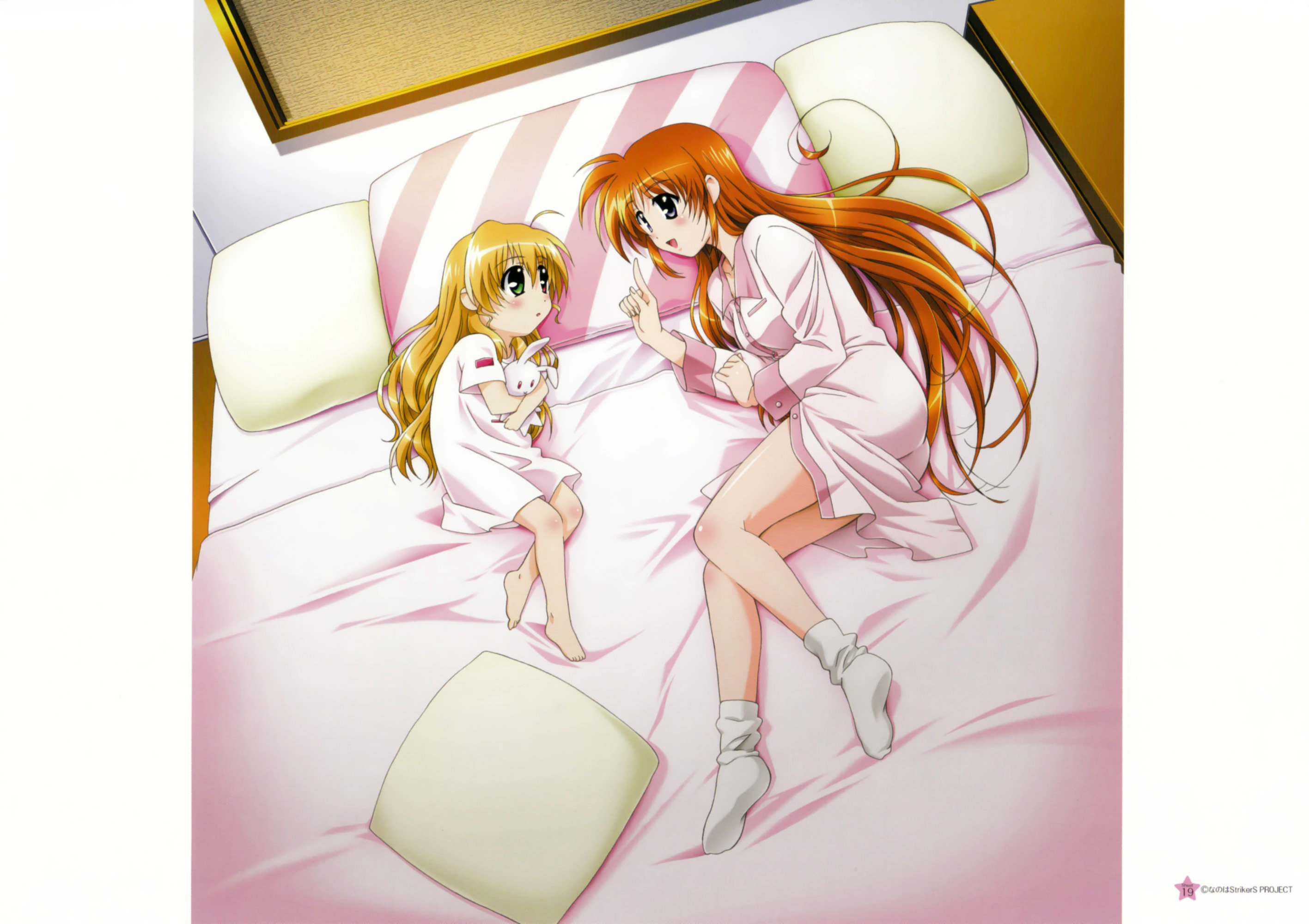 00s2girlsbedblonde hairblushbrown hairheterochromialong hairlyingmultiple girlson sidepajamaspillowpurple eyesrabbitsocks