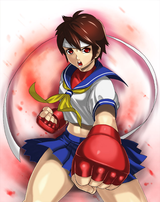 1girlblue sailor collarbrown hairfemale focusfingerless glovesglovesheadbandred eyessailor collarschool uniformserafukushort hairskirtsolo