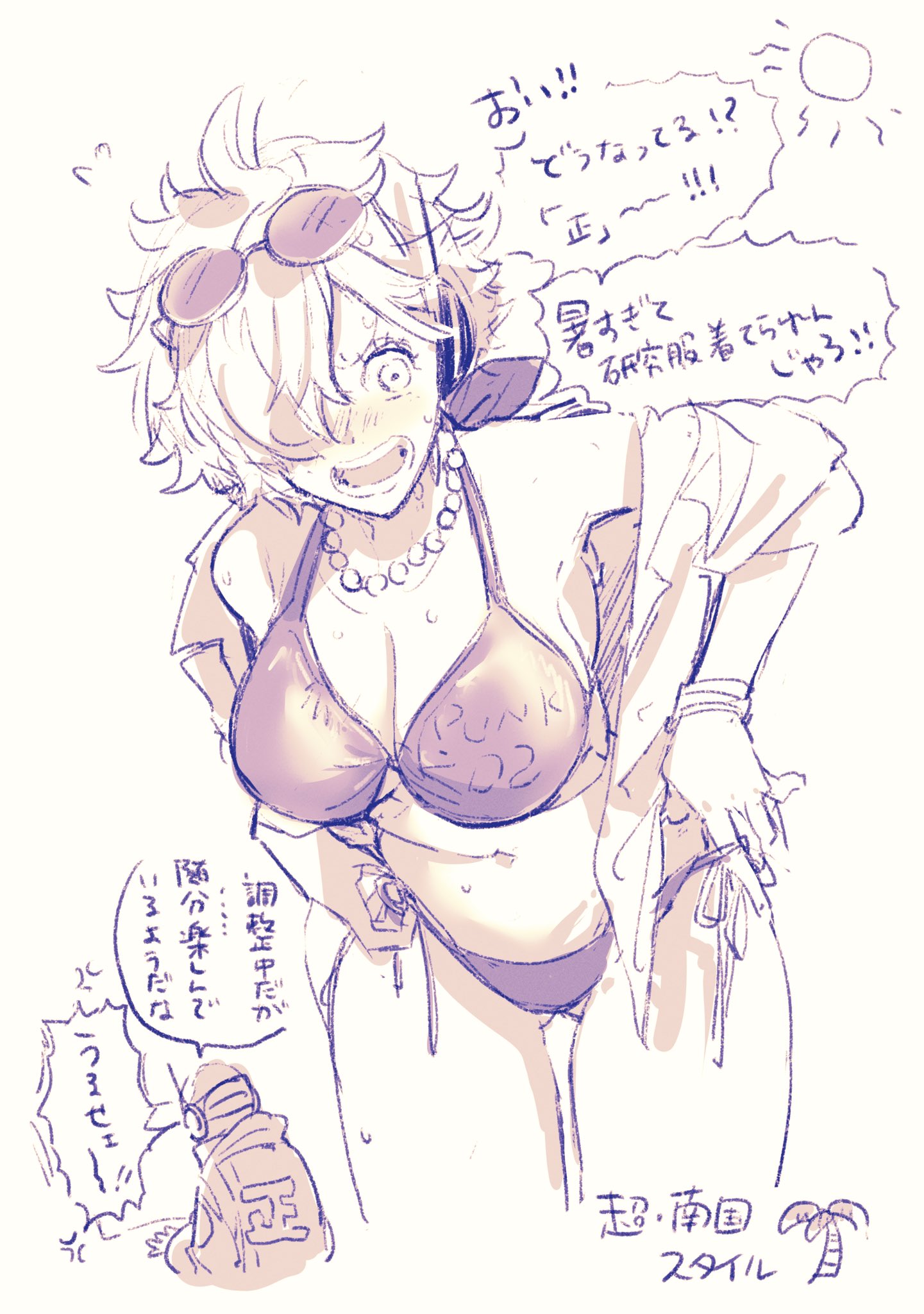 1boy1girlbikinibikini under clothesbreastscleavagecurvydisgusthair over one eyelarge breastsmonochromenarrow waistnavelopen clothesopen mouthopen shirtside-tie bikini bottomstandingsunglasses on headsweatswimsuitthong bikiniwide hips