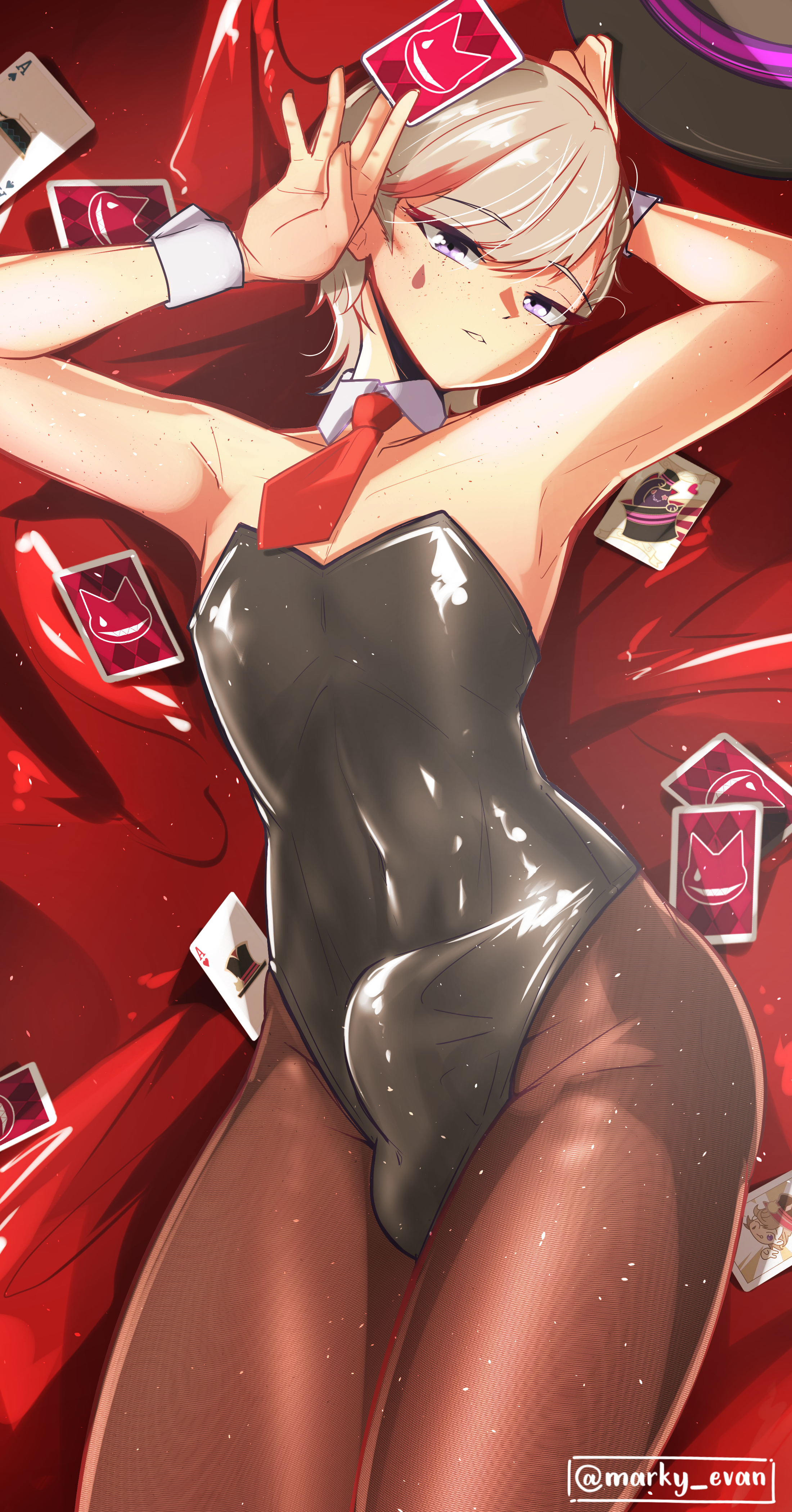 1boyarmpitsarms upartist nameblack leotardbulgecarddetached collarholdingholding cardleotardlooking at viewermale focusmale playboy bunnynecktiepantyhoseplayboy bunnyplaying cardpurple eyesred necktiesolostraplessstrapless leotardtrapunworn headwearwrist cuffs