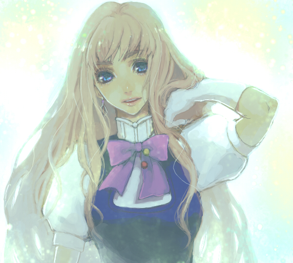 00s1girlblonde hairblue eyesbowcollared shirtelbow gloveseyelashesfemale focusgloveshand in pocketlong hairlooking at viewerlooking backpuffy short sleevespuffy sleevespurple bowshirtshort sleevessolotucking hairupper bodyvery long hairwavy hairwhite gloves