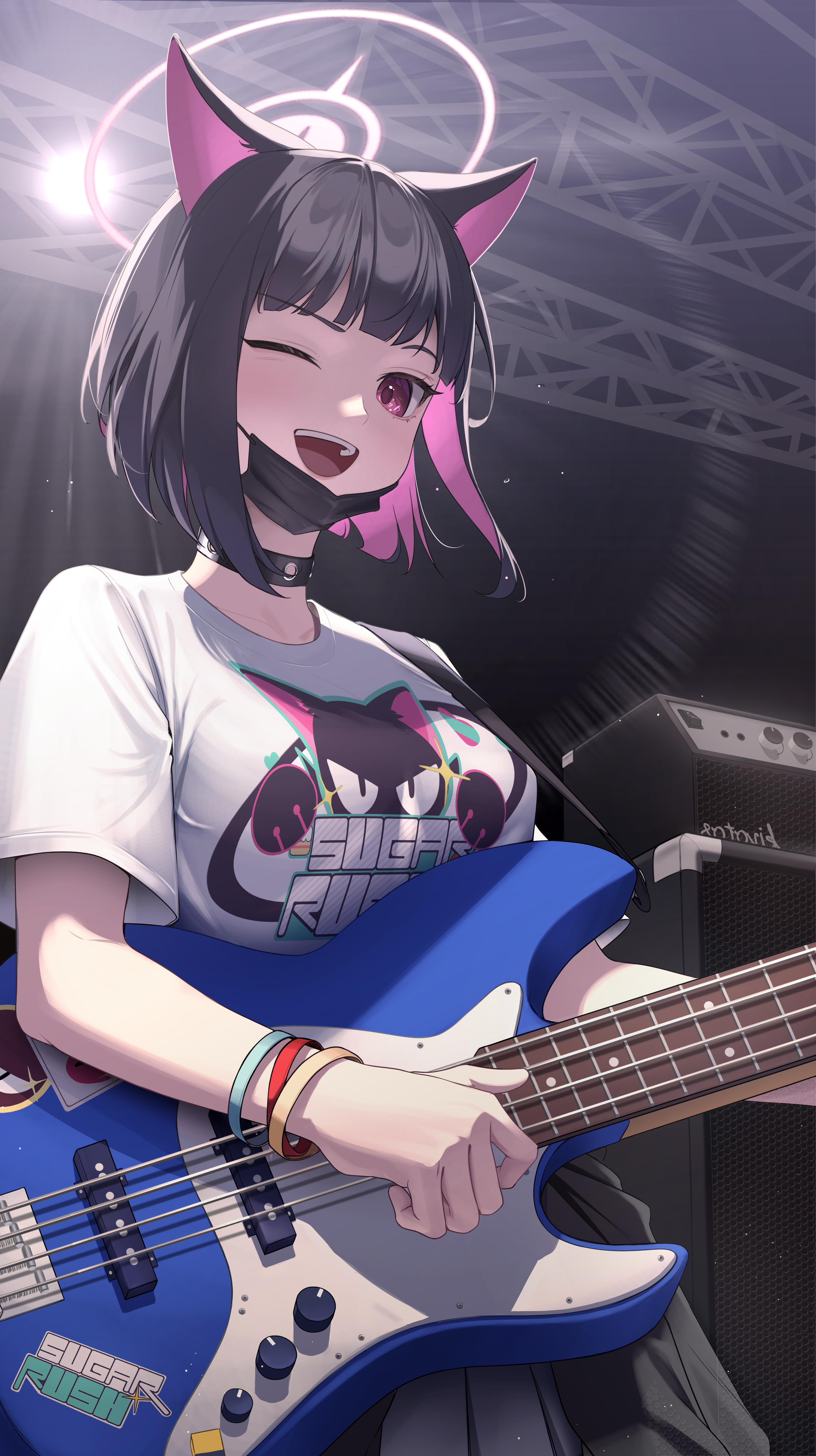 threeboon, mina (blue archive), subaru (blue archive), blue archive, 2girls, black hair, braid, coat, flute, gloves, green hair, halo, harmonica, instrument, jacket, jacket on shoulders, multiple girls, necktie, room, sunglasses, sweatdrop, tears