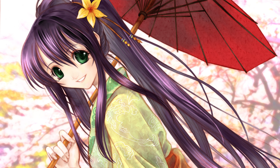 1girlfemale focusflowergreen eyeshair ornamentjapanese clotheskimonolong hairlooking backoil-paper umbrellaponytailpurple hairsmilesoloumbrella