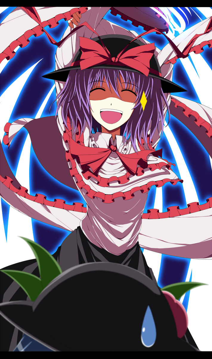1girlclosed eyesfalse smilefemale focushatletterboxedpurple hairshort hairsmilesolo focussweatdropyou gonna get raped