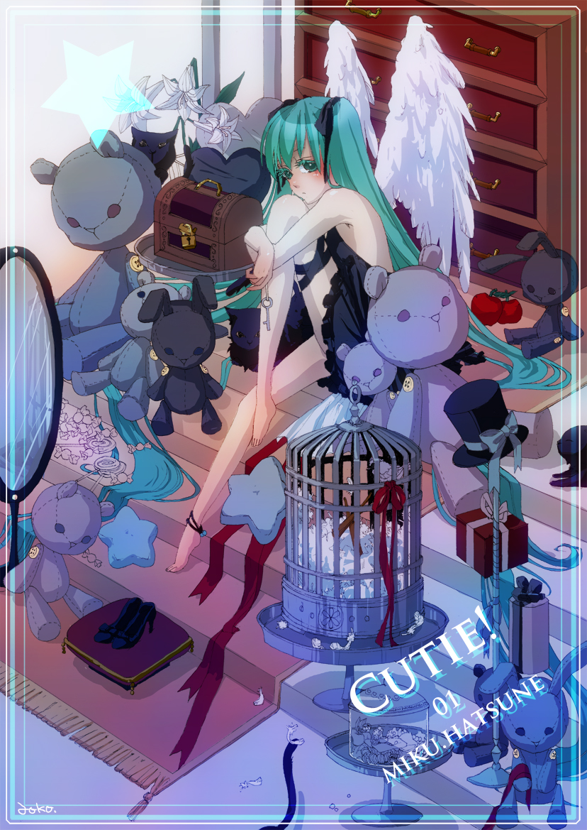 1girlangel wingsanimal earsappleaqua eyesaqua hairbarefootcagecandycatfeathersfemale focusfoodfruithair ribbonhathugging own legskeylong hairmirrorpillowribbonshoessittingsolostairsstuffed animalstuffed toytop hattreasure chesttwintailswings