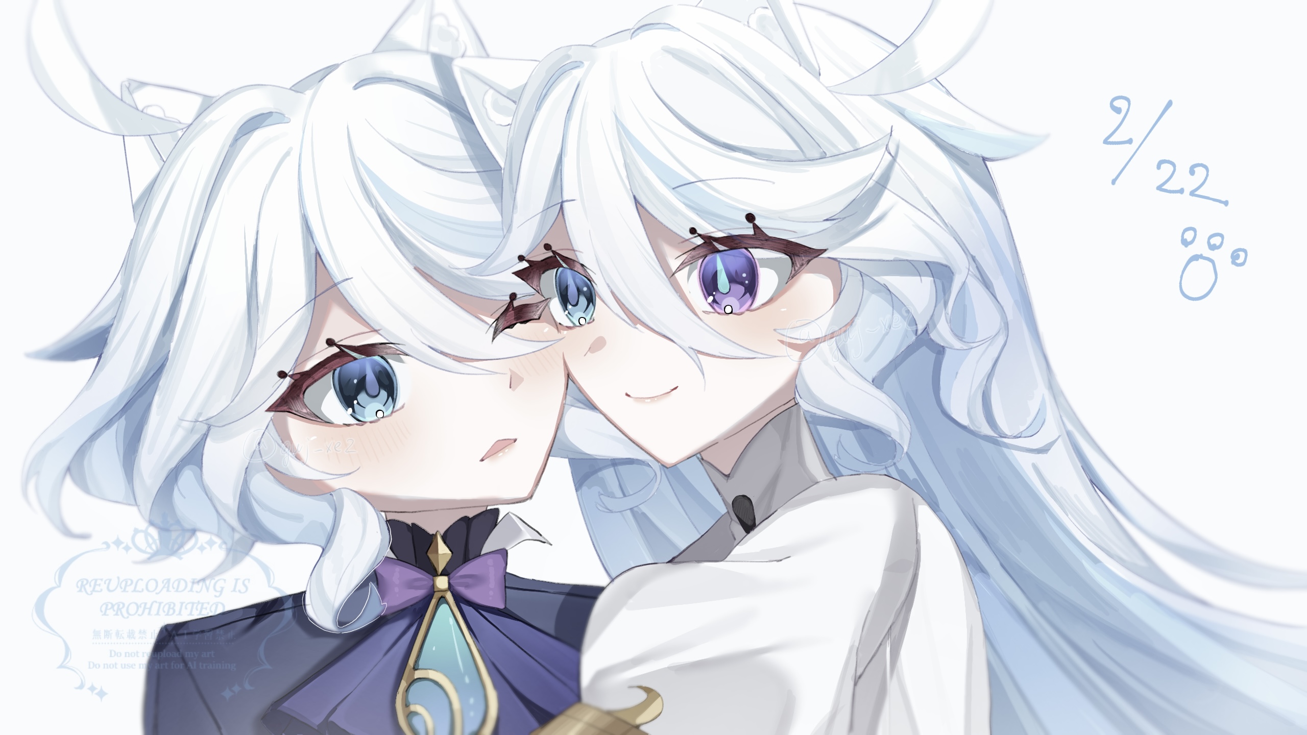 2girlsanimal earsascotblack ascotblue eyesblue hairblue jacketblushcat earsdressdrop-shaped pupilseyelash ornamentgradient clothesgradient dressheterochromiajacketmismatched pupilsmulticolored hairmultiple girlsstreaked hairsymbol-shaped pupilswhite hair