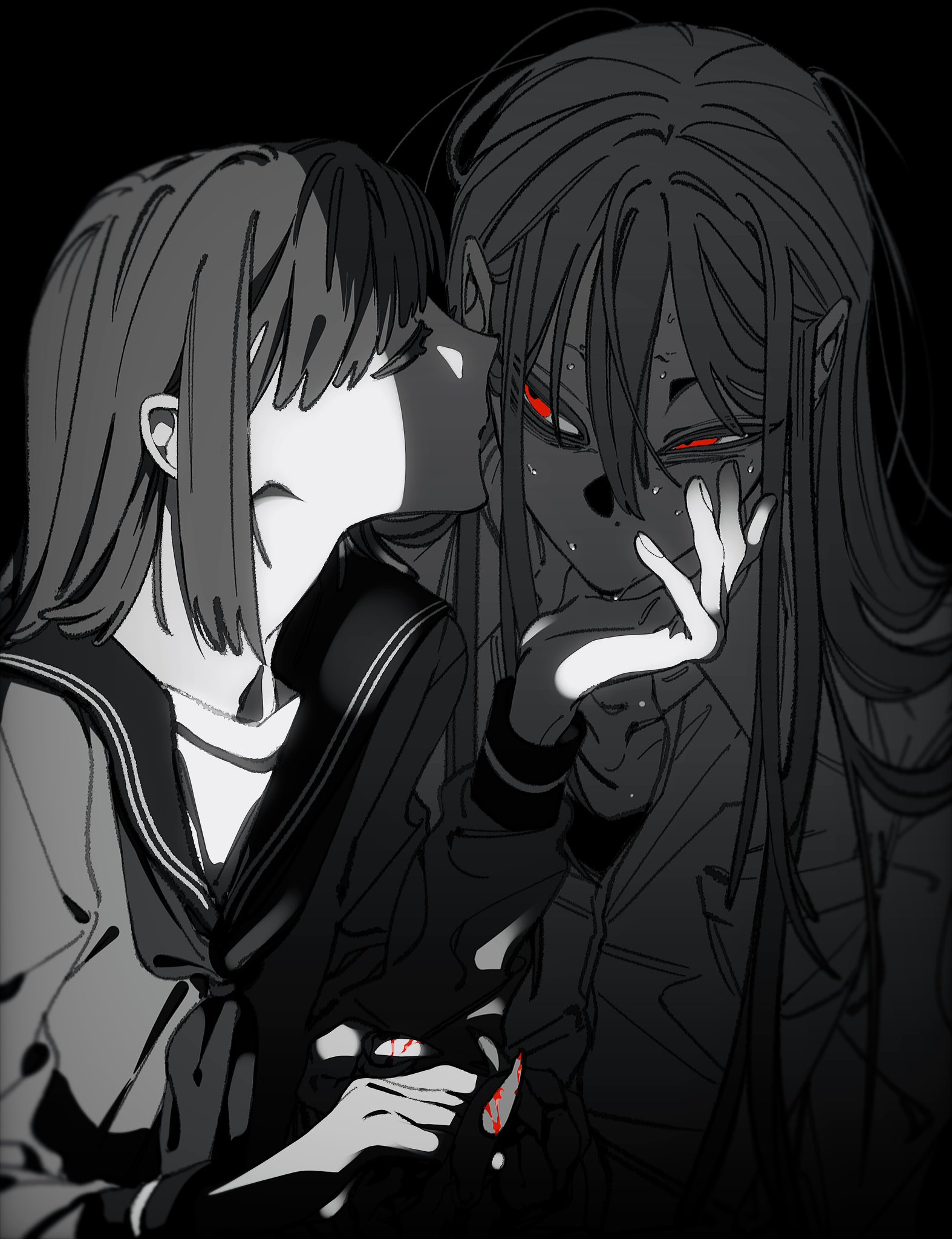 khit a, mitaka asa, yoru (chainsaw man), chainsaw man, highres, 2girls, black dress, black hair, brown eyes, collared shirt, covering another's eye, dress, facial scar, fourth east high school uniform, grey background, long hair, long sleeves, multiple girls, pinafore dress, red eyes, scar, scar on cheek, scar on face, scar on nose, school uniform, shirt, sleeveless, sleeveless dress, white shirt